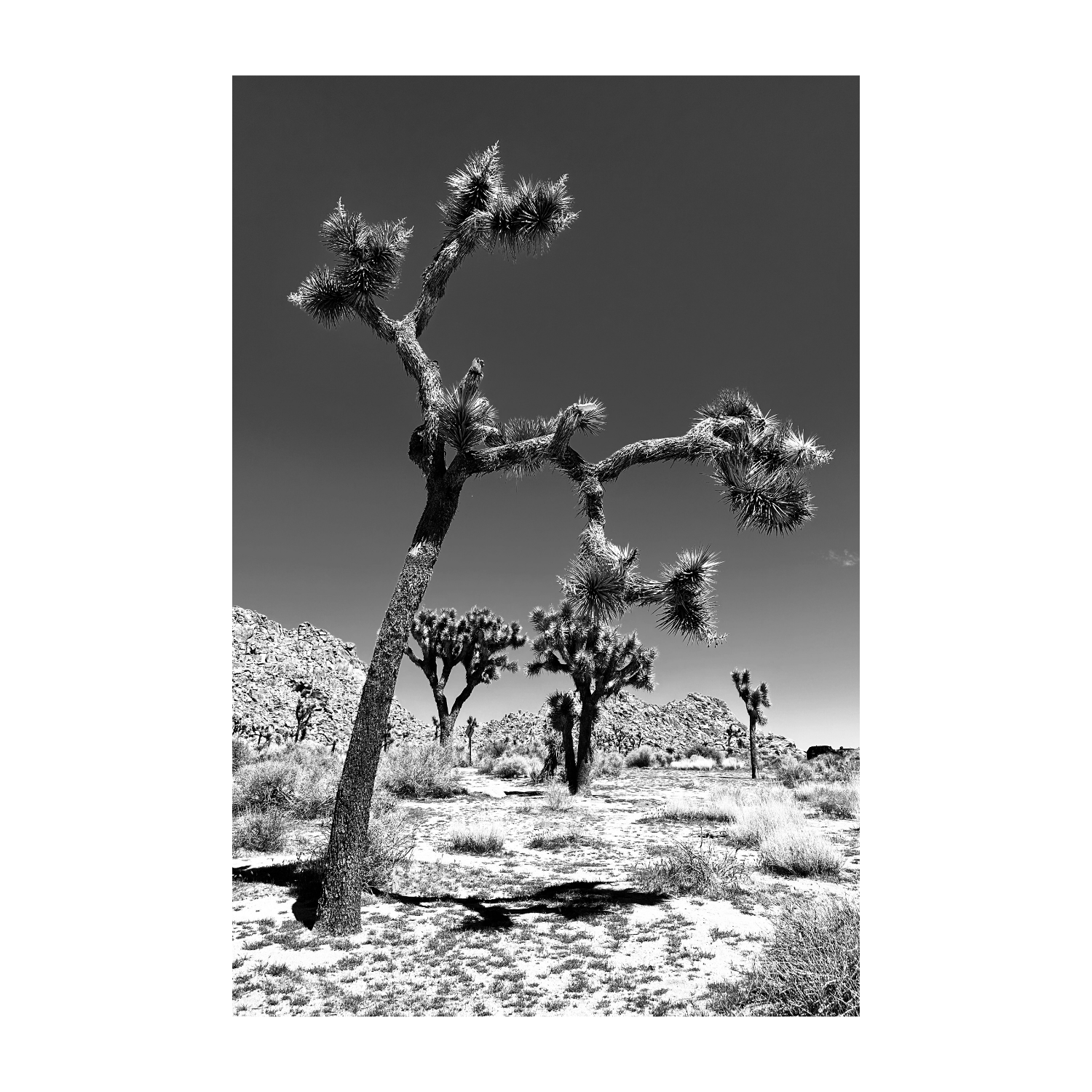 A black-and-white photograph of a Joshua tree in Joshua Tree National Park CA