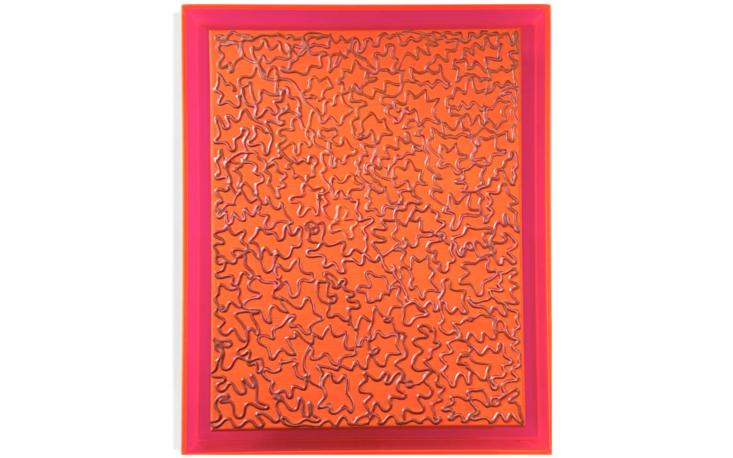 A vibrant abstract piece created in bold neon orange, layered with glossy red-violet raised lines that move like an energetic maze. The artwork is mounted in a neon plexiglass floater frame, amplifying the glow and giving the entire piece a futuristic, electric presence. Bright, saturated, and full of movement — this is a statement work built to command attention.