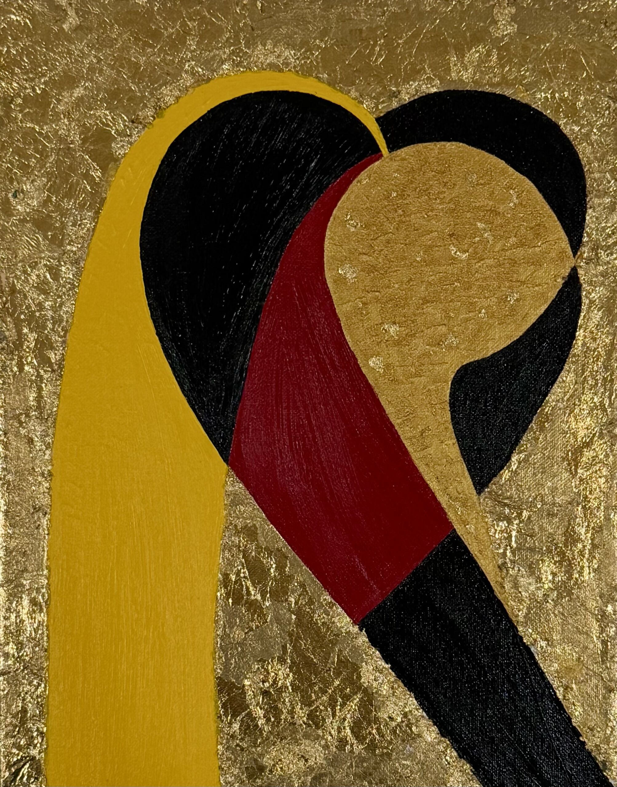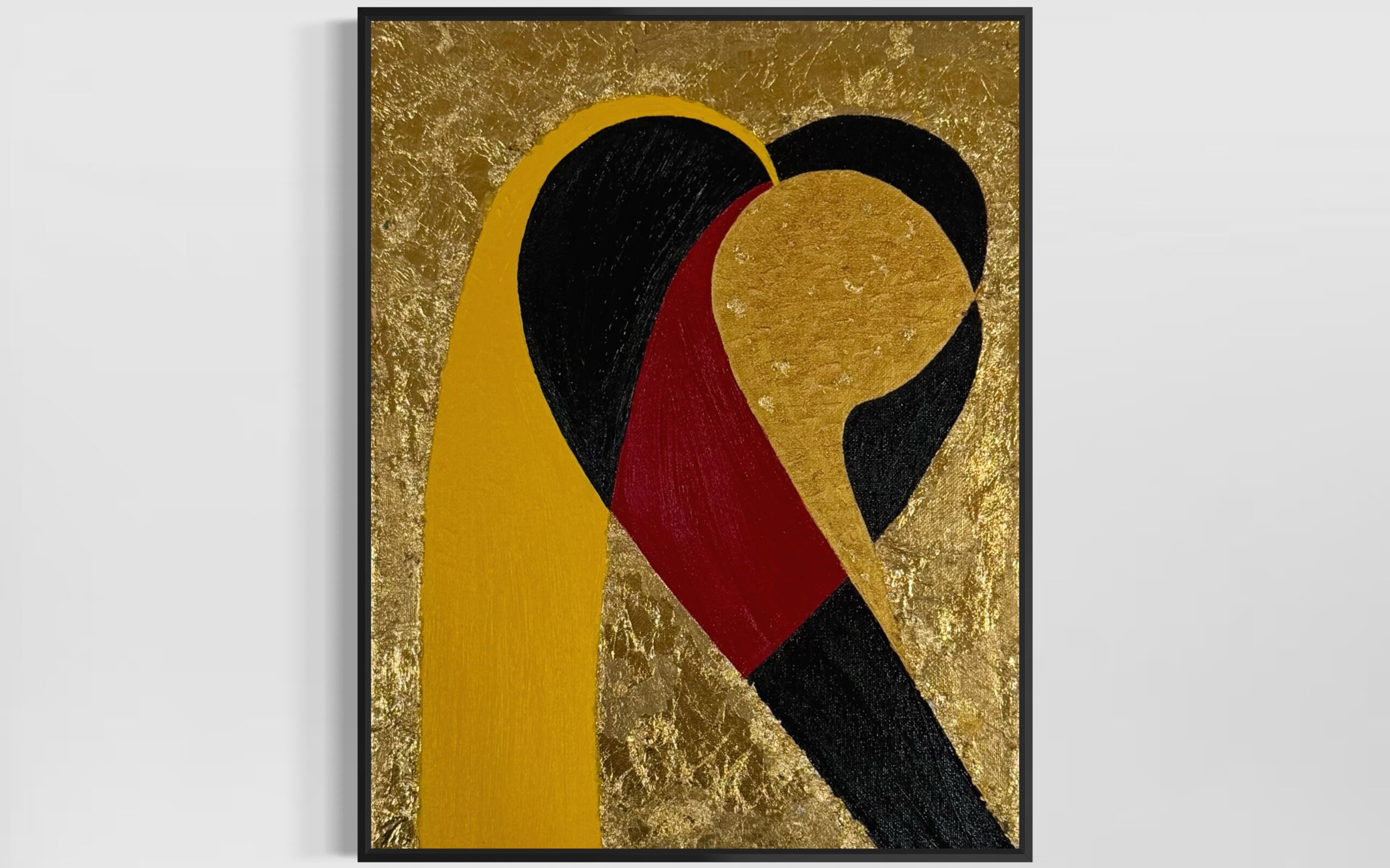 A minimalist yet powerful composition, “Heart Fusion” blends bold shapes and rich colors into a single, unified form. Deep black, vivid red, and warm gold converge in an abstract heart-like silhouette, symbolizing connection, devotion, and the merging of two energies. The textured gold leaf background adds a luminous, sacred quality, giving the piece both elegance and emotional depth.