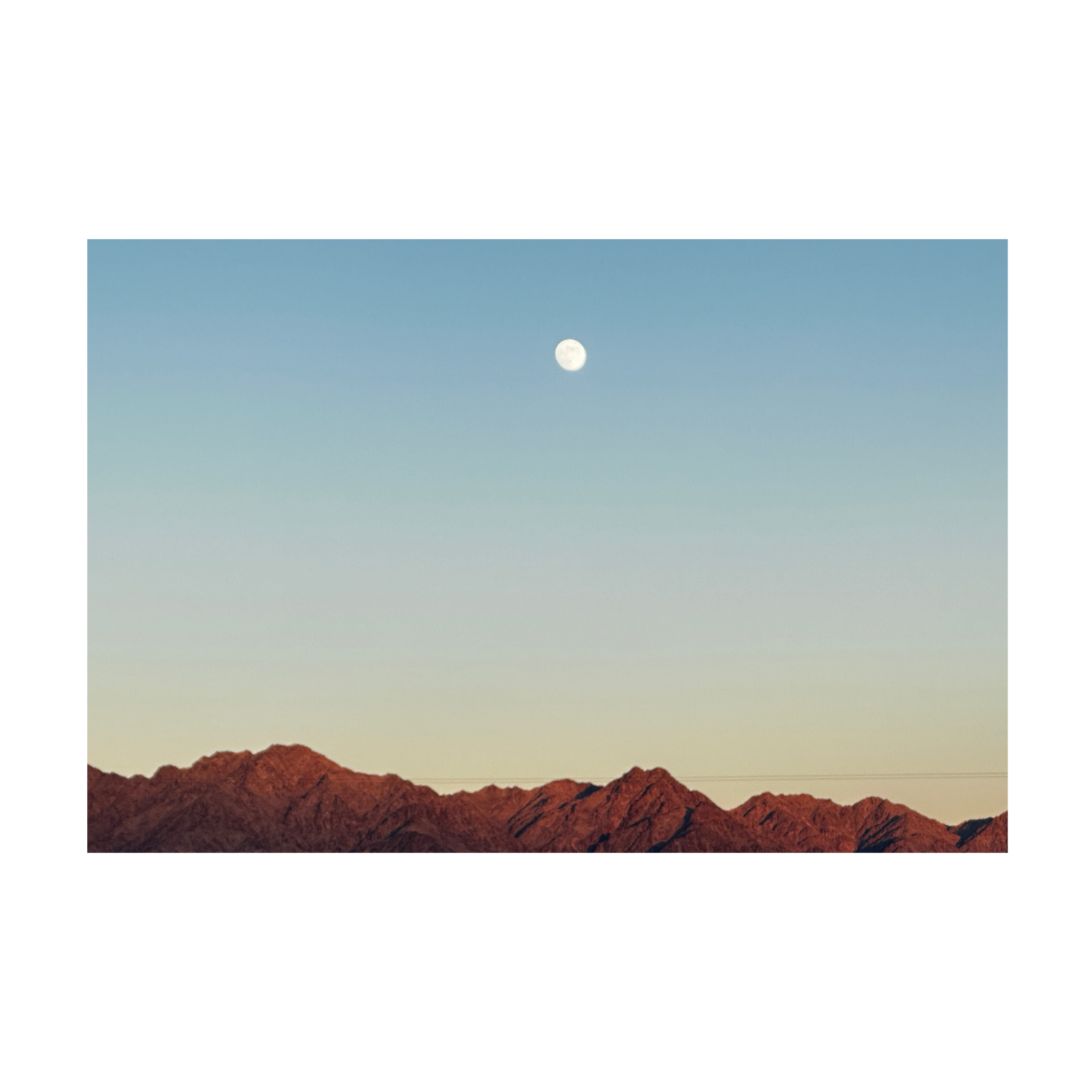 Captured in Wonder Valley CA, this photograph shows the moon suspended over sunlit desert mountains. The soft gradient sky and warm canyon tones create a calm, open landscape that feels both minimal and expansive.