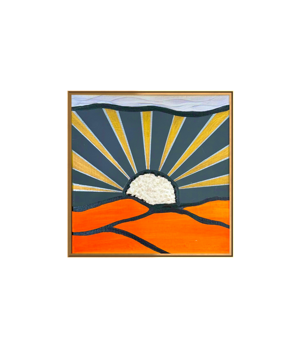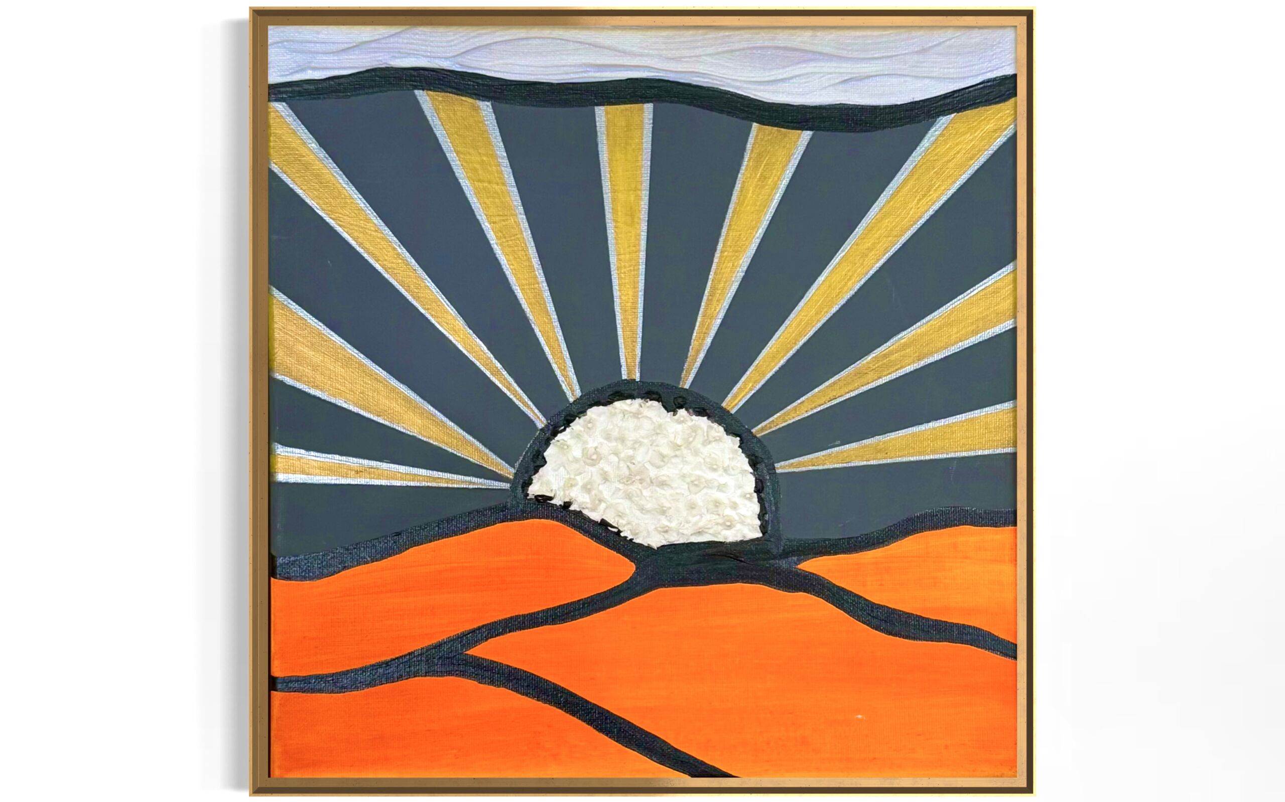 A bold, abstract take on desert dunes at golden hour. Deep orange waves rise beneath a textured sun, framed by radiant gold beams against a muted sky. The piece blends acrylics with tactile detailing to capture the warmth, movement, and quiet energy of a sunset settling over the